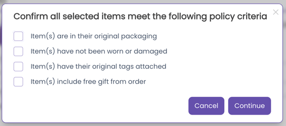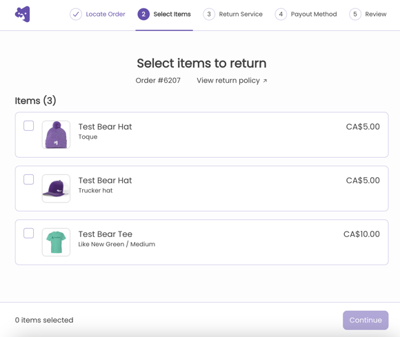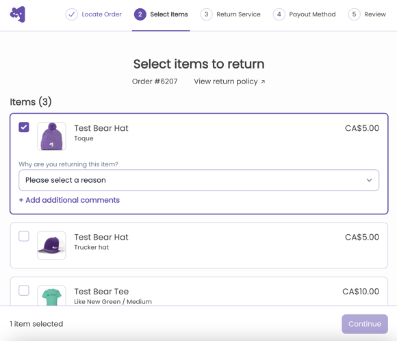 Repeat these steps for as many items as are being returned. Once all items have been selected, click Continue.