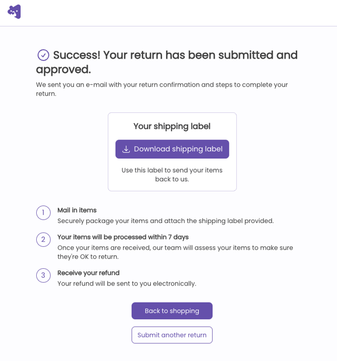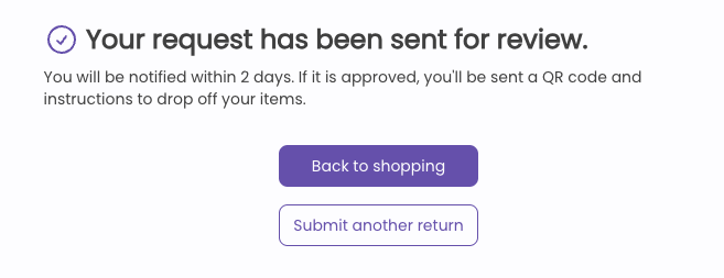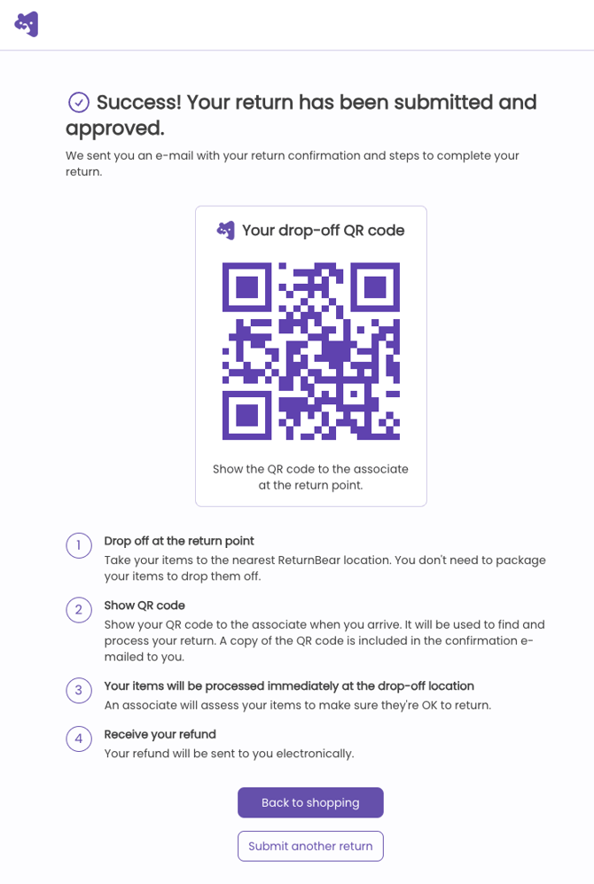 If all criteria was checked off on the Return Policy Checklist, the return will be automatically Approved. The confirmation page will display either a QR code or the option to download a shipping label, depending on the Return Service chosen in Step 3. An email containing the QR code or shipping label is sent to the customer as well.