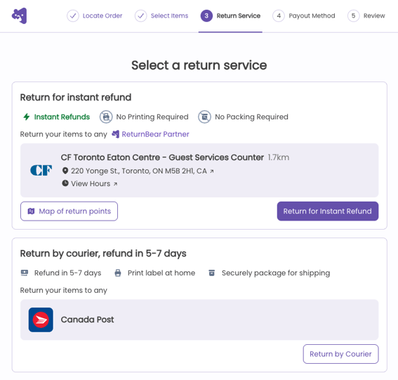Click Return for Instant Refund to select this return service. If selecting an alternate ReturnBear return point from the map, click Select return point.