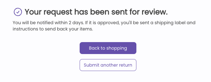 If one or more of the criteria was not checked off on the Return Policy Checklist, the return will enter Pending status. The confirmation page will display a message indicating that the return has been sent for review: