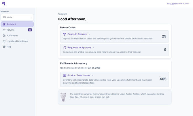 The Assistant is the home base in the ReturnBear Admin. It's the first thing you'll see when you log in, designed to give you a clear, prioritized list of actions needed to keep your returns process running smoothly.